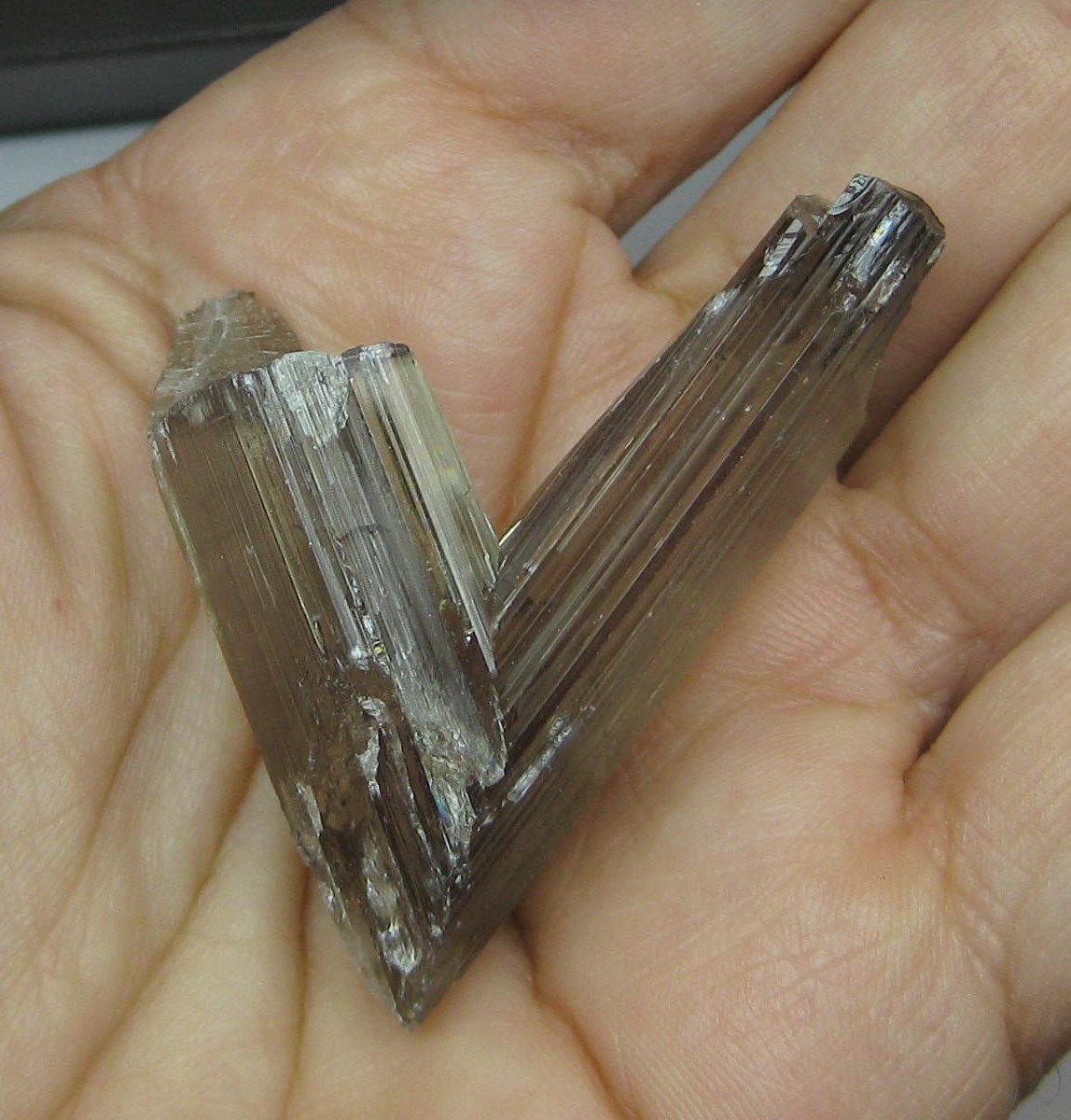 Gem V twin, short end contracted, long broken, a chip at point.