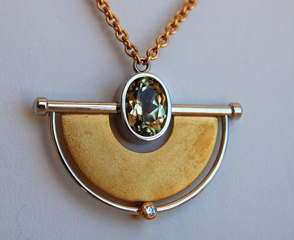 Gold and Platinum Chain with Pendant. The focus of this beautiful pendant is a 2.54 carat Oval Zultanite® Gem. The metals are 950/-Platinum and 750/-Gold (18K). The pendant measures 33mm x 25mm (about 1.3”x1”). Length of the chain is 45cm (18 inches).